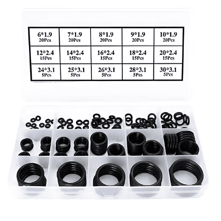 - CAJA 2: 200 UNIDADES O-RING MEDIDAS DE 6mm x 1.9mm a 30mm x 3.1mm (diámetro x espesor de goma).